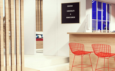 Le lieu propose aussi un espace coworking à l’étage qui se décline en une salle de réunion, des bureaux, des espaces communs et une terrasse patio. Ambiances : épurée, chaleureuse, aérée, chic et cosy.