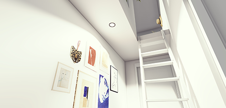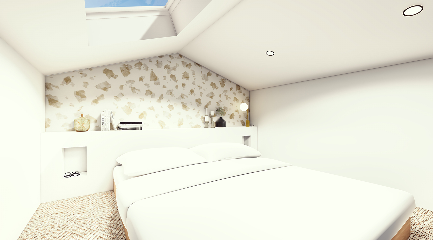 Nous avons commencé par “éclairer” la pièce de vie en l’habillant de couleurs claires, de rangements qui structurent l’espace et d’un beau poêle blanc chaleureux. Ensuite, nous avons fait émerger cette 4e chambre en suivant ce processus : déplafonner les deux chambres existantes,  récupérer la hauteur sous plafond et ainsi, créer une nouvelle chambre en mezzanine. Elle se présente sous forme de large caisson superposé au-dessus des deux chambres, bien que chaque chambre reste indépendante. Quelques touches de couleurs subtiles (doré, vert sapin, bleu profond) contrastent avec les fonds clairs tandis que de magnifiques papiers peints colorent  chaque pièce d’une ambiance singulière.